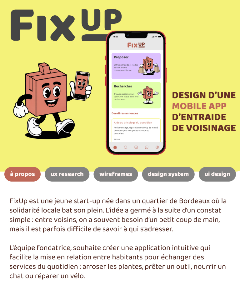 FixUP est une application mobile qui facilite l’entraide et l’échange de services entre voisins.