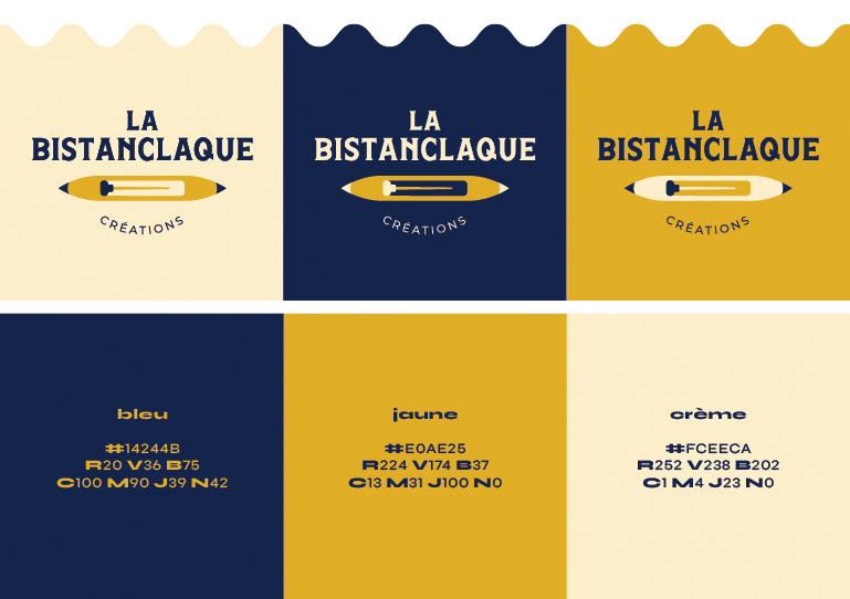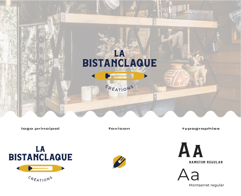 La Bistanclaque project Logo design - 2025 La Bistanclaque is a concept of upcycled craft objects. 🤹 My graphic magic tricks ➛ designing a logo inspired by a weaving shuttle sketch. back to projects retour